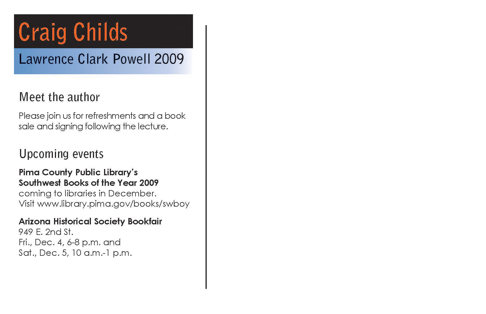 Pima County Public Library's Lawrence Clark Powell Lecture advertising in postcard format. Adobe InDesign, Illustrator, and Photoshop.