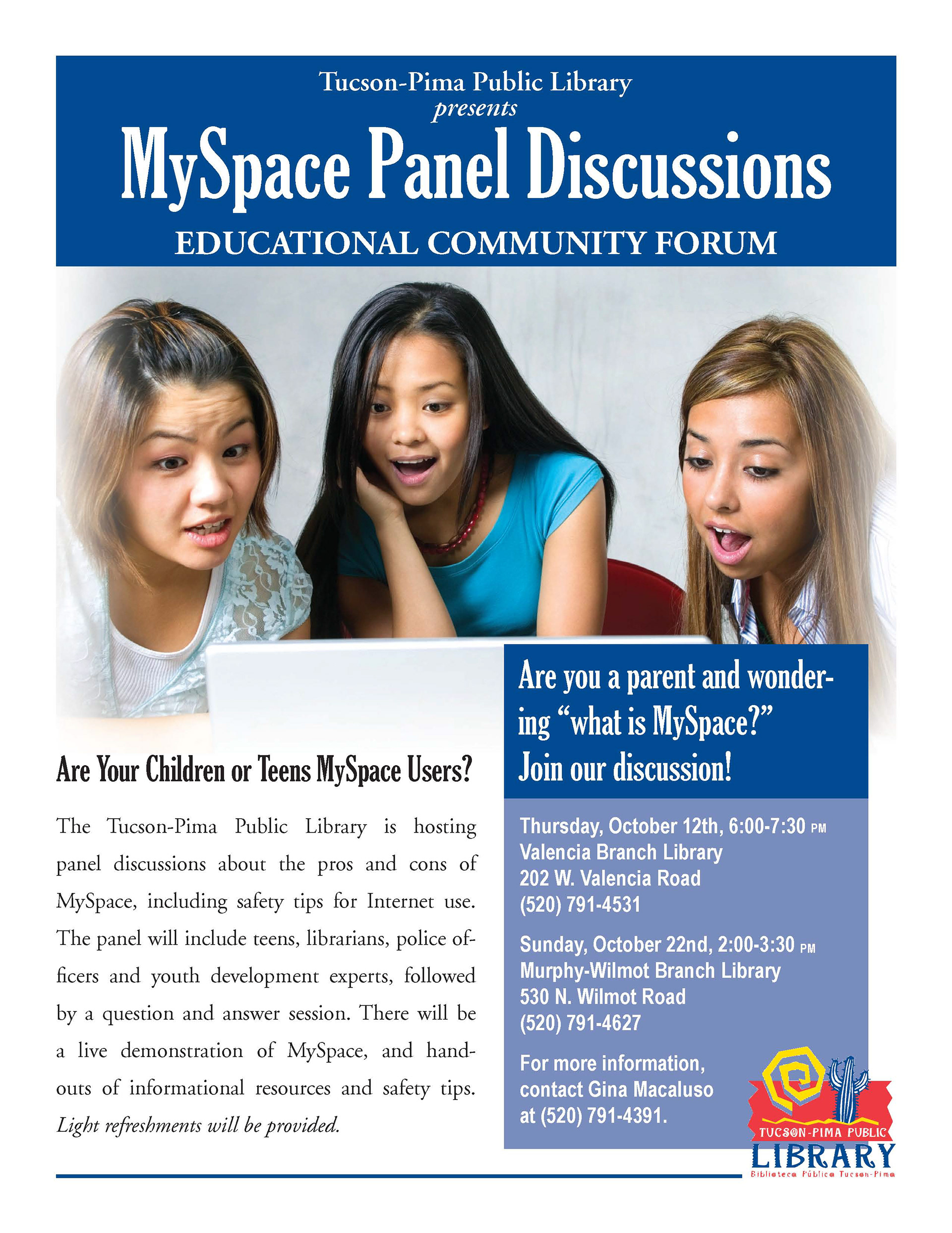 Pima County Public Library hosted an educational discussion forum for the community on the topic of MySpace social networking site.